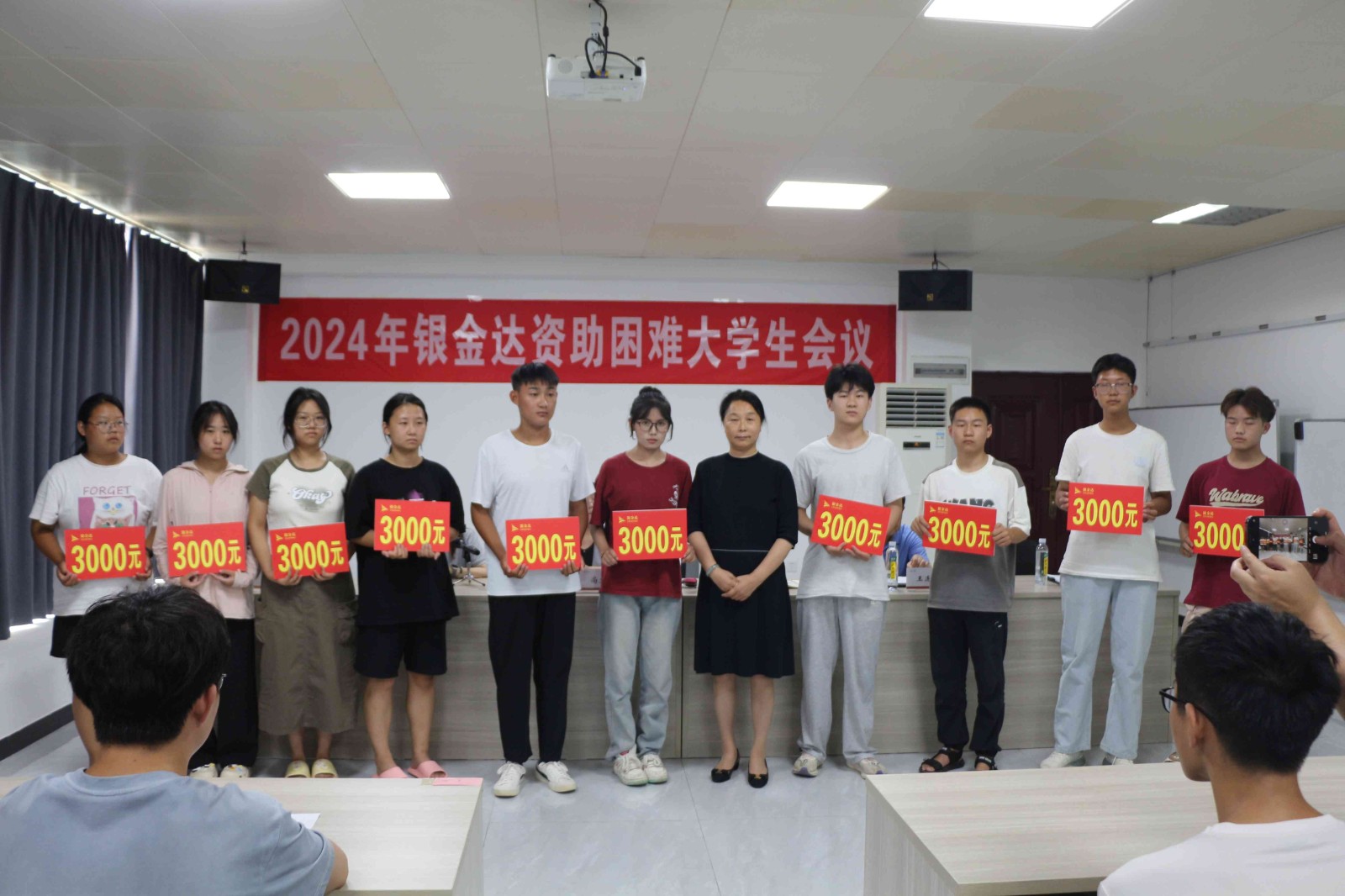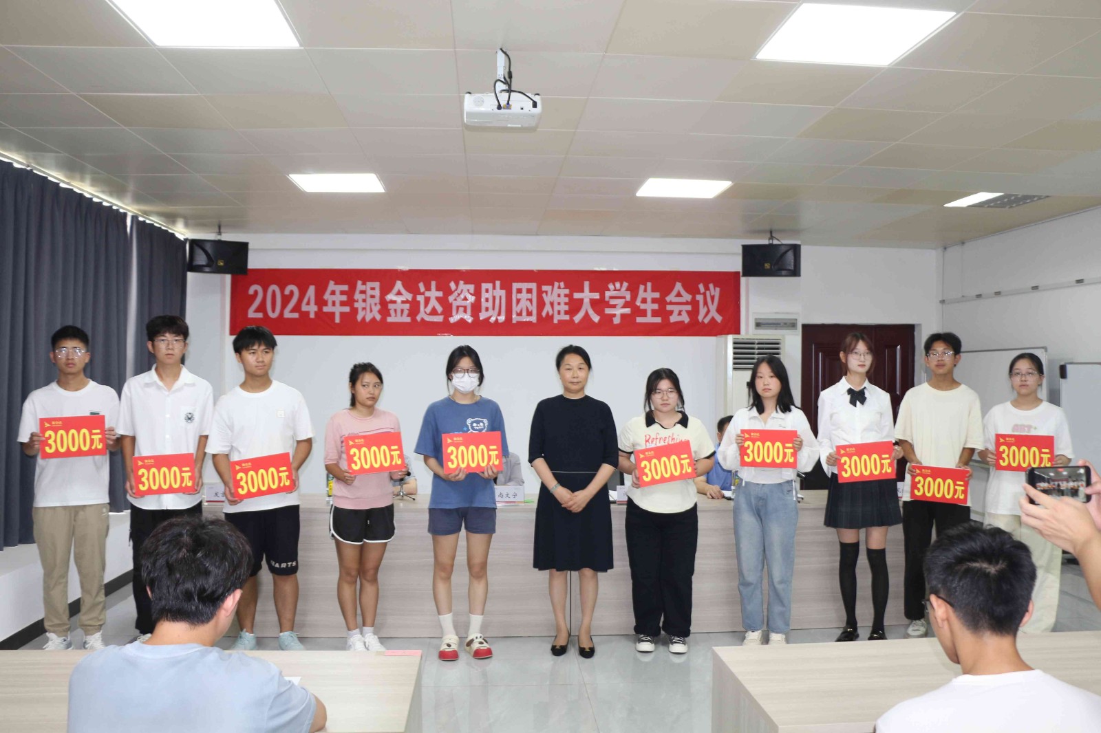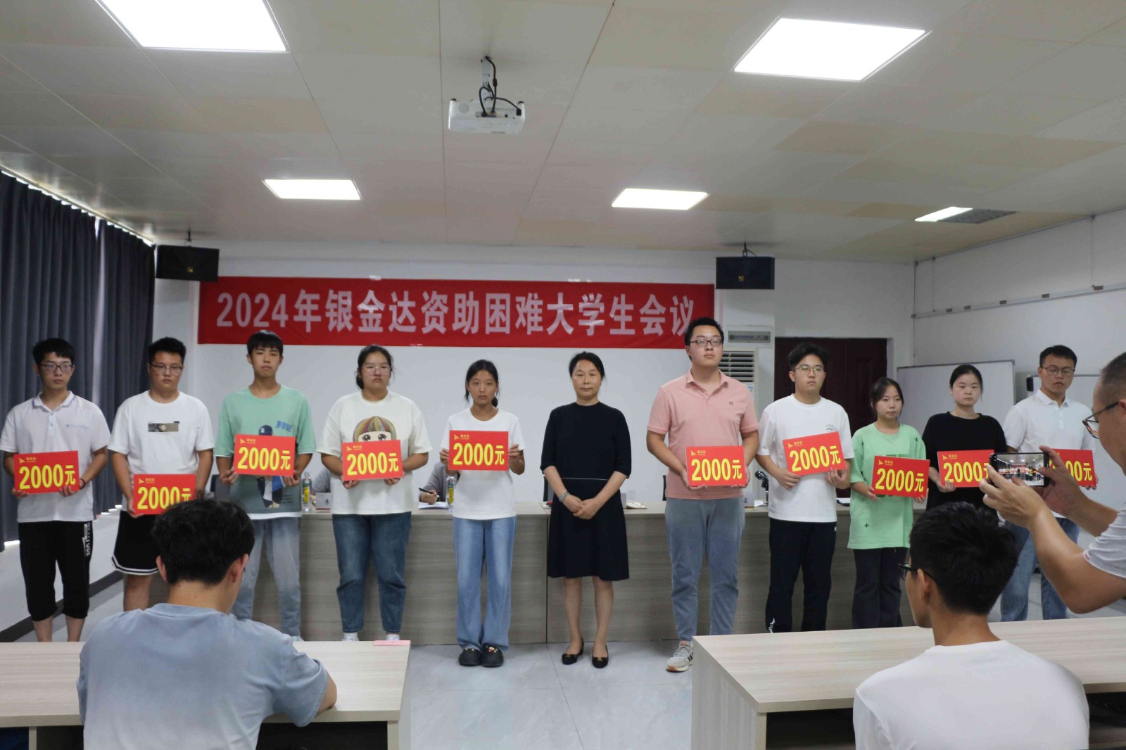 銀金達(dá)集團(tuán)黨委書記、董事長(zhǎng)閆銀鳳親自為各位困難大學(xué)生發(fā)放資助金。